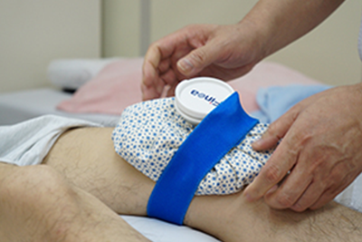 当院では、温罨法として湿性のホットパックを使用し、局所循環の改善、筋緊張の緩和を図り、冷罨法として氷嚢に小さなキュービックアイスを使用します。患部及び関節部分の冷却を行います。